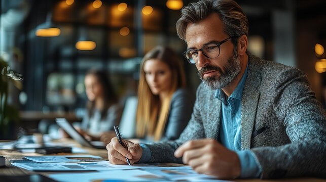 Business presentation by a professional in a suit indoor setting document in hand corporate environment