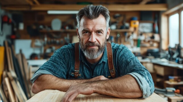 A bearded man poses confidently in his woodshop, surrounded by tools and materials, showcasing the artistry and craftsmanship involved in woodworking.