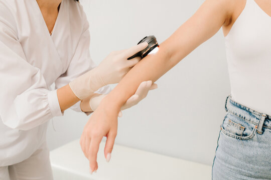 Dermatologist Examining Girl Skin with Dermatoscope. Dermatoscopic analysis aids in the detection of suspicious skin spots using dermatoscope during a clinical exam.
