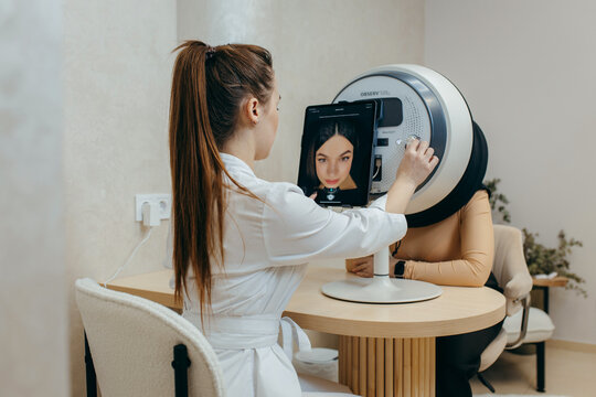Dermatologist Examining Girl Skin with Dermatoscope. Dermatoscopic analysis aids in the detection of suspicious skin spots using dermatoscope during a clinical exam.