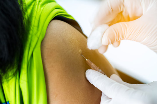 A male doctor makes an important Mantoux test on a child. The doctor measures the Mantoux test with a ruler for a little boy