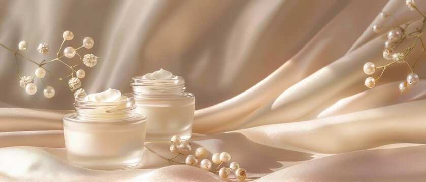 High-end skincare jars with pearl details on a soft satin backdrop, luxury skincare, copy space