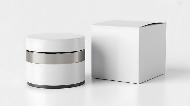 Glossy cosmetic jar and packaging box with blank label on white background for branding and beauty product mockup