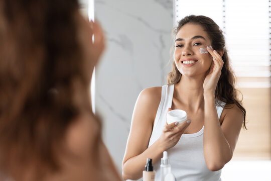 Young Female Applying Cream On Cheeks Moisturizing Facial Skin Indoors