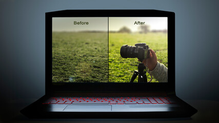 Image manipulation software in a laptop in office. Transforming girl skinnier and slim for marketing or advertisement. Photo editing and beauty standards concept.