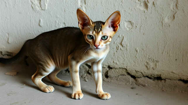 old skinny cat, emaciated moggy in front of dingy wall, gaunt kitten
