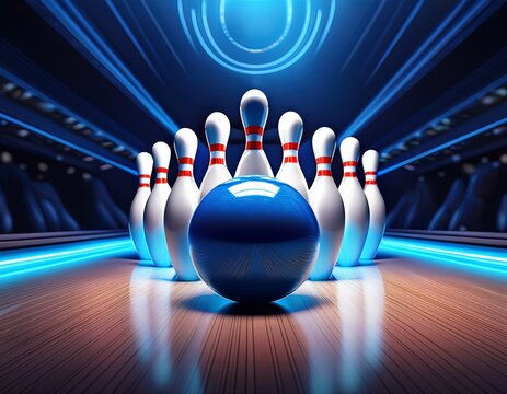 bowling ball strikes pins in blue light 3d rendering bowling bowling alley strike