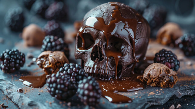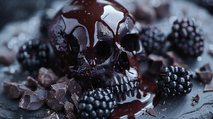 A close-up shot of a dark chocolate skull, half-melted, with drips of caramel oozing from its eyes, surrounded by blackberries and shattered cookie pieces on a spooky stone plate.