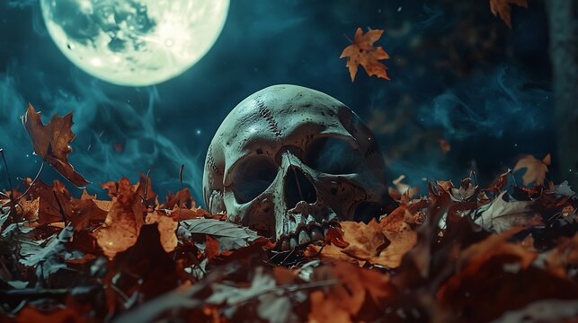 Halloween Snow Globe with Creepy Tree, Skull, and Haunted Town in the Display Under a Glass Dome - Unique Halloween Themed Background with Copy Space