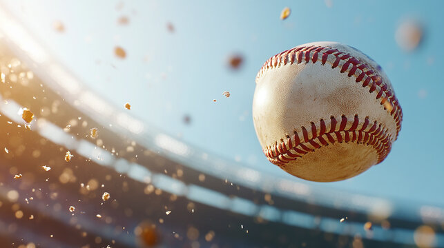 A dramatic close-up of a baseball soaring through a clear blue sky