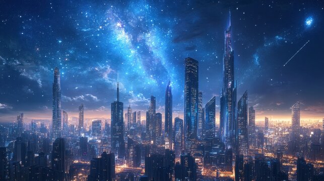 A futuristic cityscape with sleek skyscrapers and advanced technology elements illuminated against a dark, starry sky