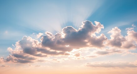 Sunbeams illuminating pastel cumulus clouds in vibrant sky
