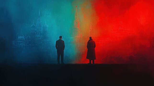 Dramatic standoff between two secret agents in a vibrant cityscape under dusk sky, conveying tension and intrigue in a covert operation
