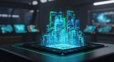 A futuristic holographic projection of a city skyline, glowing with blue and green digital particles, displayed on a futuristic platform.