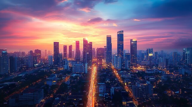 Modern city skyline at dusk with twilight glow