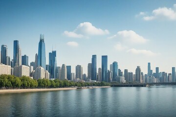 City skyline with skyscrapers and waterfront view