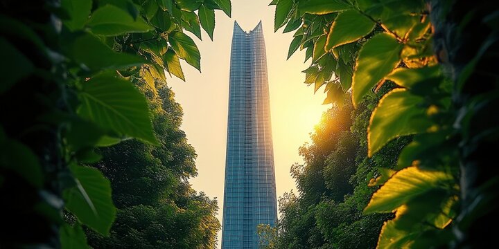 A captivating skyscraper bathed in an eerie crimson glow, enveloped by a mysterious fog
