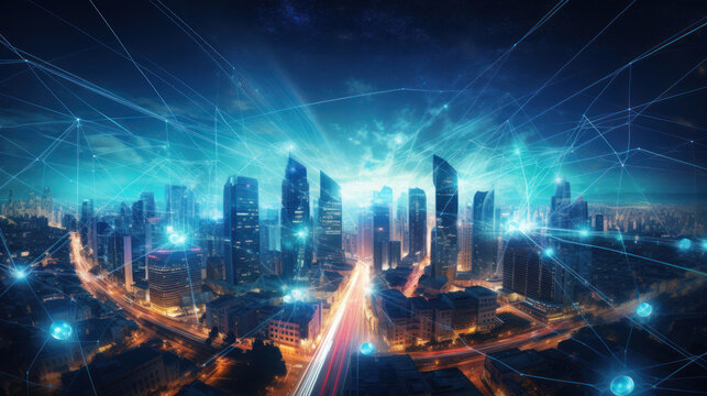 Futuristic cityscape with a glowing blue digital data network overlay.