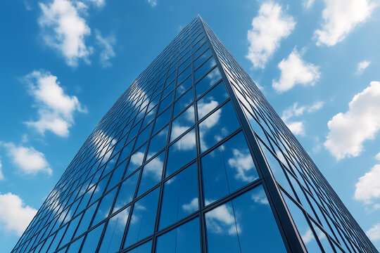 Modern skyscraper with glass facade reflecting bright blue sky and white clouds symbolizing architecture business and urban development