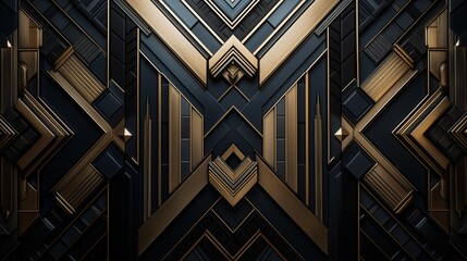 A complex geometric art deco pattern featuring dark and metallic gold elements, creating a modern and stylish design. The composition includes sharp angles and layered.