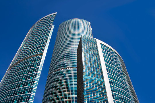A low angle shot of modern skyscrapers in a city, showcasing their impressive height and architectural design against a cloudy sky, creating a sense of awe