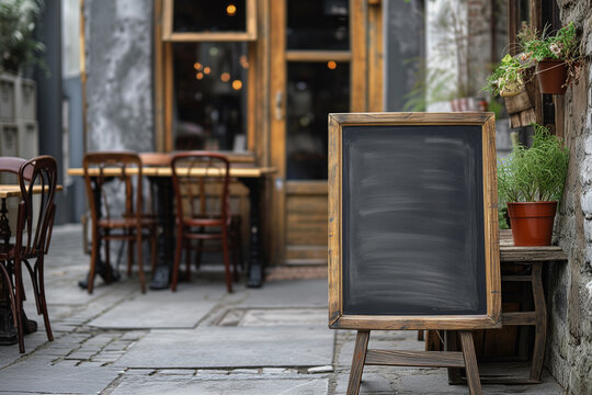 Blank restaurant shop sign or menu boards near the entrance to restaurant. Cafe menu on the street. Blackboard sign mockup.