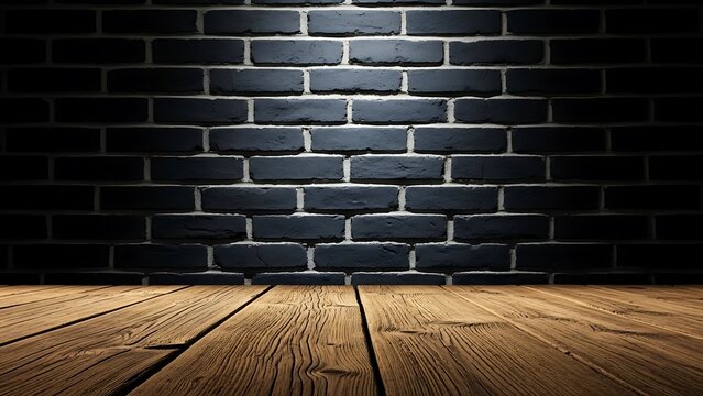 A spotlight shines down on a wooden floor in front of a dark brick wall