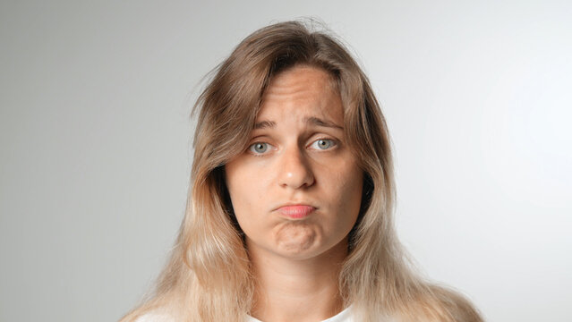 Beautiful person look at camera close up. Young adult woman face portrait. Stylish 30 years old girl on isolated white background. Attractive female feminism model. Modern millennial feminist people.