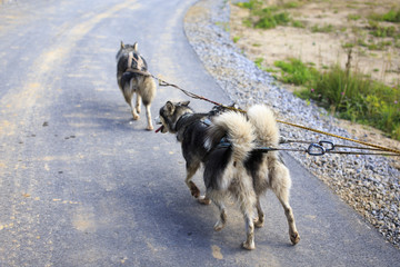 tired sled dogs. tired husky sled dogs in harness running along the road, rear view