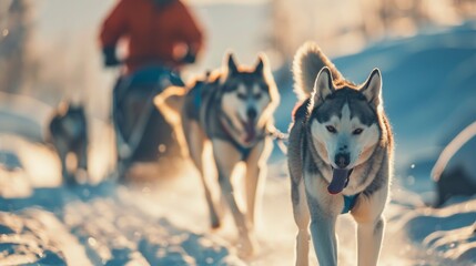 Portrait of Husky dogs in dog sledding in cold winter with snow