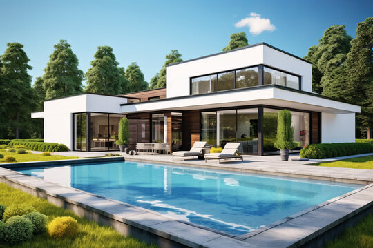 Luxury modern white villa with pool and balcony