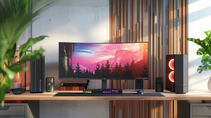 A sleek gaming setup features a black mouse pad, illuminated keyboard, and a high-resolution monitor in a dimly lit environment.