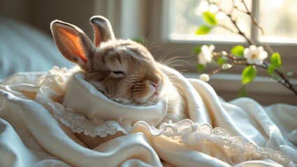 Sleeping baby rabbit nestling in warm cream blanket with soft fur and golden glow