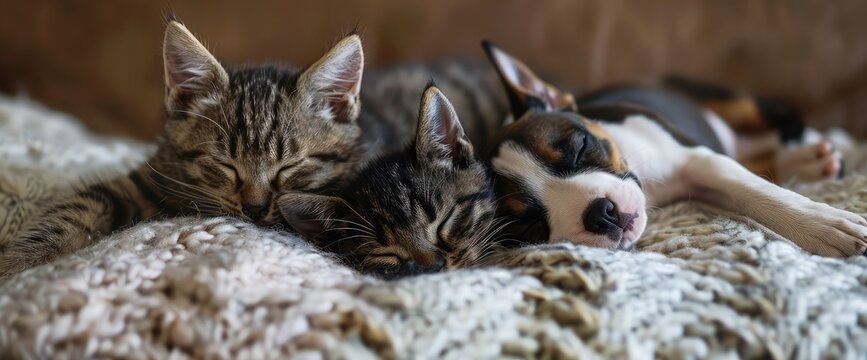 Young Bengal Cat kitten playing and sleeping with her Boston Terrier friend