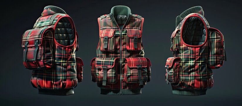 Three-quarter view of a red and green plaid vest with multiple pockets and a backpack feature