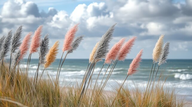 Golden-brown sea grass dances elegantly with the breeze, its slender, wavy blades curving gracefully at their tips