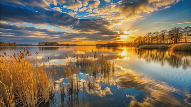 Golden reeds by calm lake at sunset