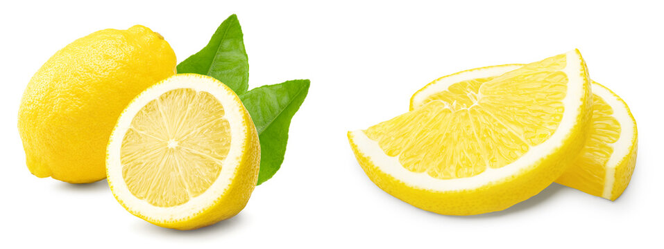 lemon with slice and green leaves isolated on white background. clipping path
