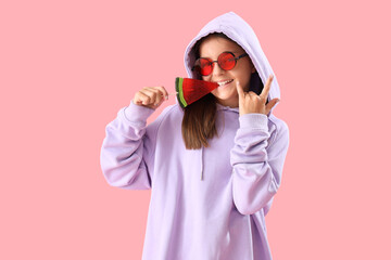 Juicy watermelon slices on rustic wooden background