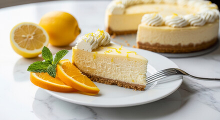 Close-up of a tasty lemon cheesecake slice, elegantly plated with whipped cream, lemon zest, fresh mint, and vibrant orange on white marble.