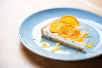 a slice of premium gourmet blueberry cheesecake on a dark plate, garnished with fresh blueberries and a drizzle of blueberry sauce, black background