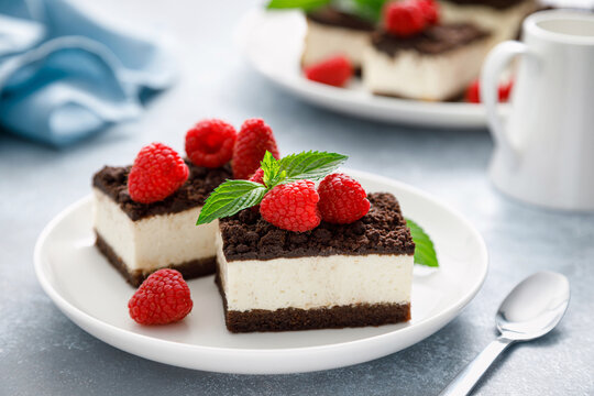 Chocolate cube cake, sliced brownie cheesecake with fresh raspberry