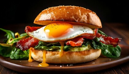 A hearty breakfast sandwich featuring a fried egg with a runny yolk, crispy bacon, avocado slices, and baby spinach