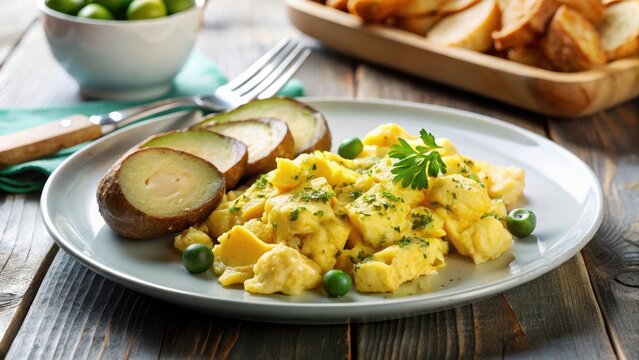 Scrambled eggs on a plate with sliced gherkin and roast potato , egg, kitchen