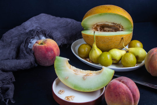 Melon lies on an oval plate, next to it, on a saucer a sliced ​​lobule. Metalic knife, peaches, cloth, dark background. Still life.
