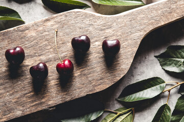 top view of red cherries on a bowl with slices of peaches on a wooden kitchen board with knife on a white background