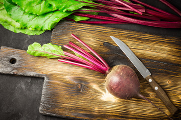 Raw beetroot sliced with leaves on rustic board . Top view with copy space.