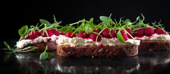 Red beet bread sandwiches with cream cheese, tomatoes and microgreen on black. side view.