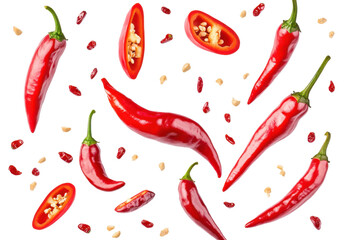 Red hot chilli peppers, chili slices and green leaves isolated on white background. File contains clipping paths.