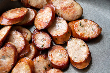 Close-up of smoked sausages with fresh tomatoes and herbs on reflective surface